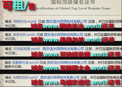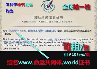 我公司所有下列靓丽的战略域名 www.命运共同体.world www.划时代贡献.world www.网络共治.world www.美美与共.world www.可持续发展.world www.乌镇欢迎您.world www.wewelcome.world ************************************************** 用最互联网的方法 热烈庆祝习近平主正式提出 网络空间命运共同体的伟大理念 10周年 点赞网络空间命运共同体对网络空间的 划时代伟大贡献 演示了:由我公司多个中文域名链接到贵盛会网站的通畅性 无人机灯光秀应用效果图如下